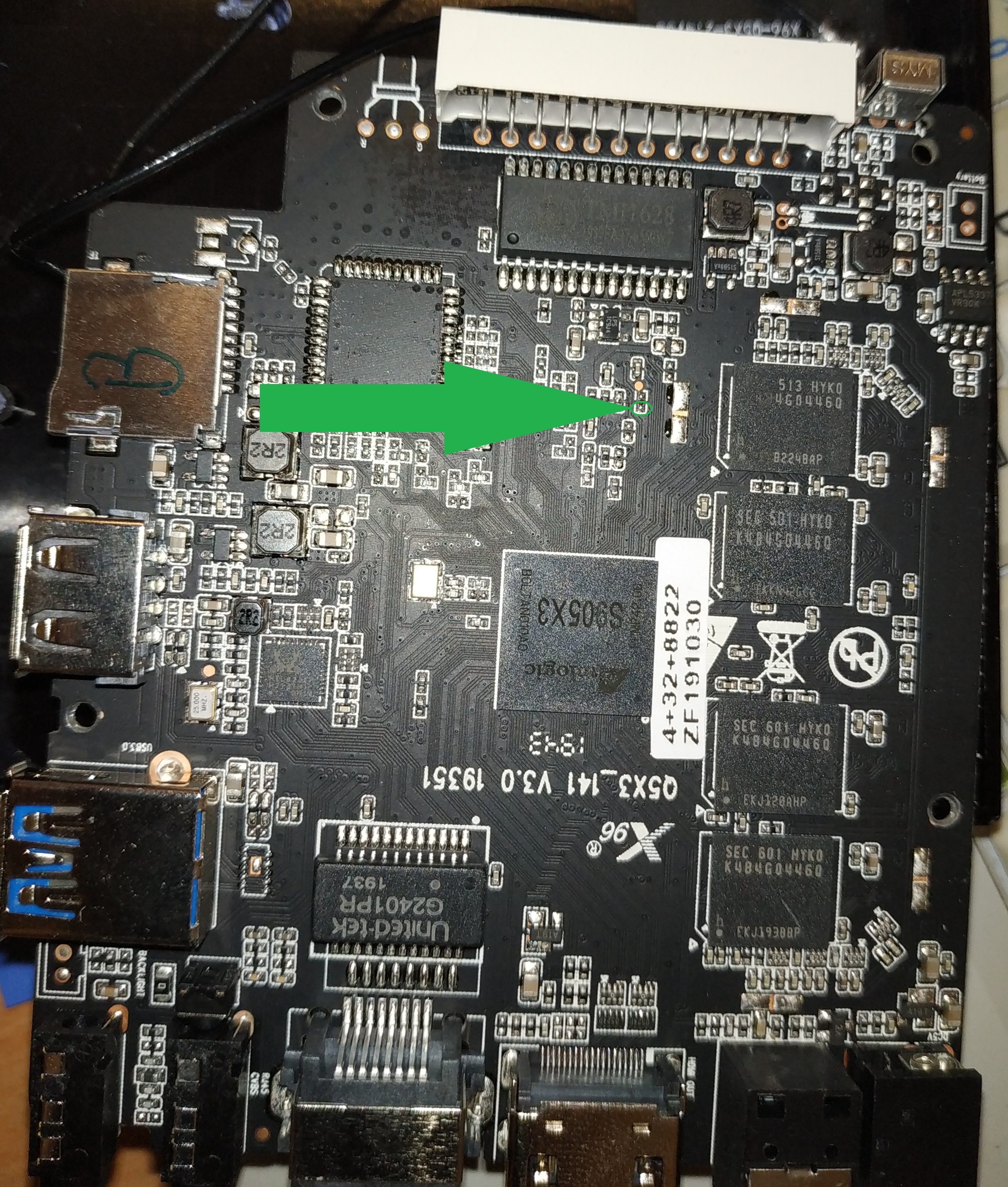 3. Briefly short-circuit the point with the USB connector housing (ground), the computer will see the x96 max plus and the firmware will start.